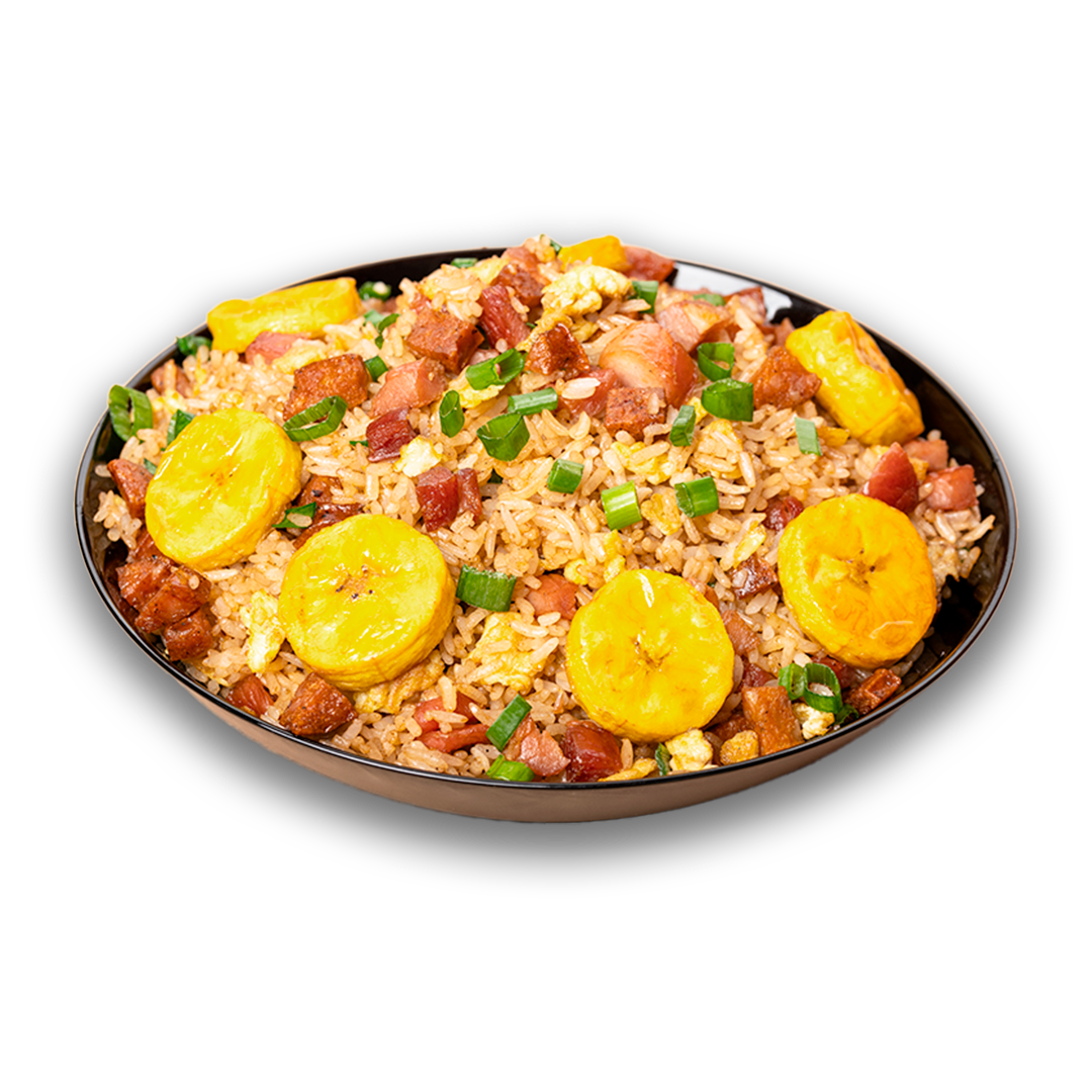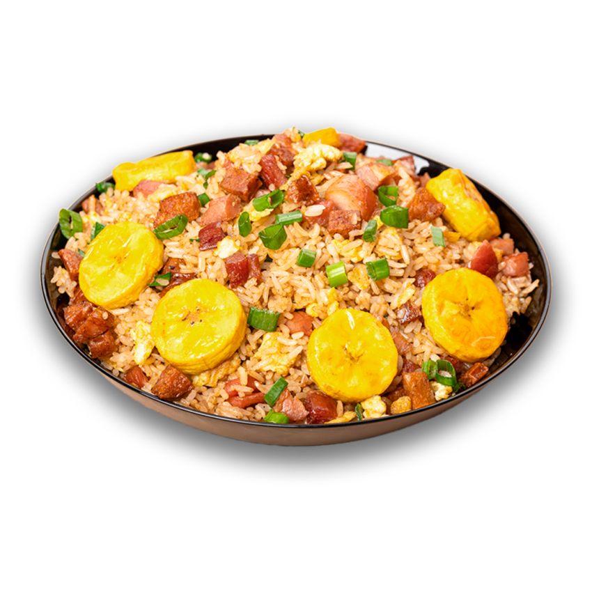 Arroz estilo oriental con huevo, cebolla china, cecina ahumada, chorizo regional, plátano frito y bebida a elegir, 355 ml.