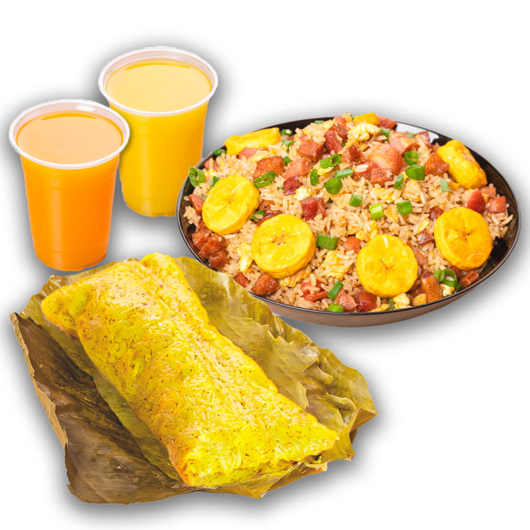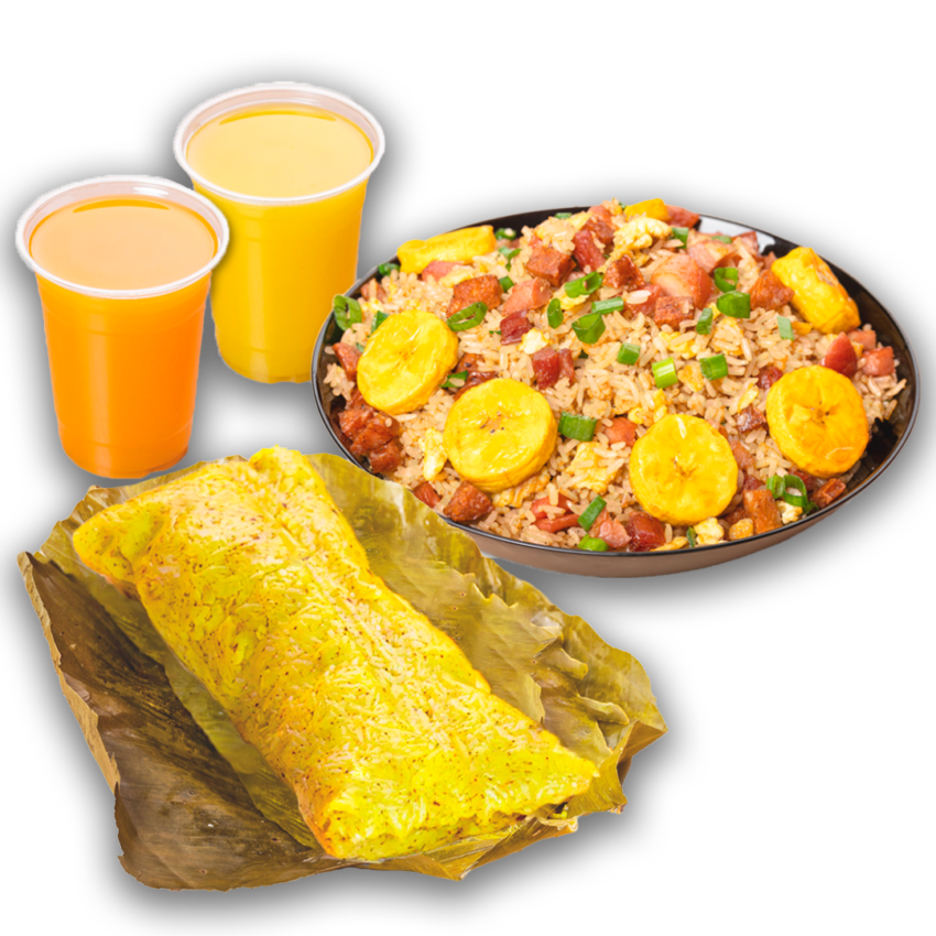Arroz estilo oriental con huevo, cebolla china, cecina ahumada, chorizo regional, plátano frito y bebida a elegir, 355 ml.