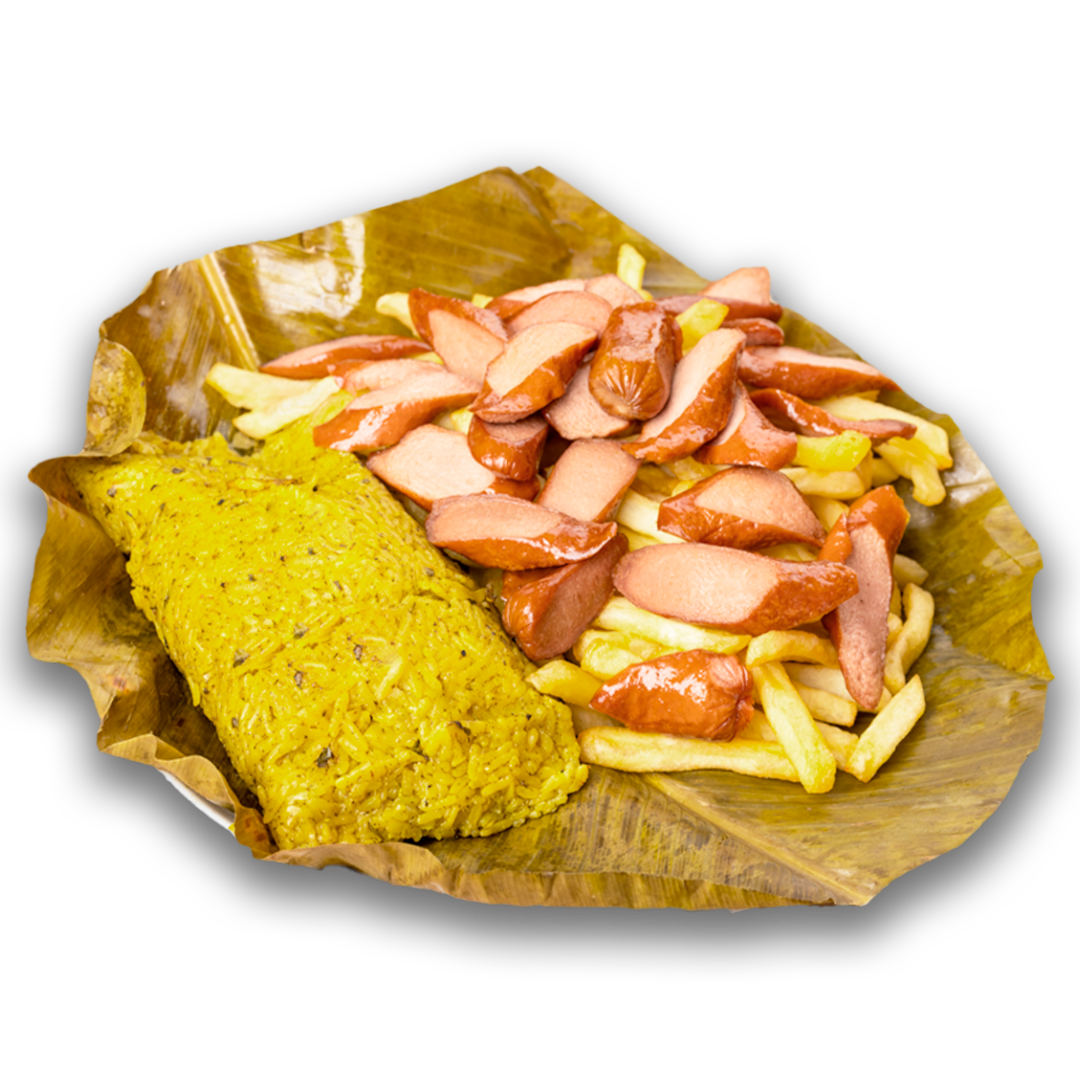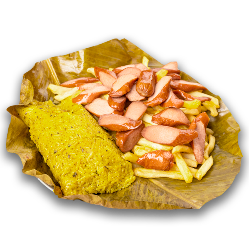 Arroz estilo oriental con huevo, cebolla china, cecina ahumada, chorizo regional, plátano frito, papas fritas, salchicha frankfurter en láminas y…